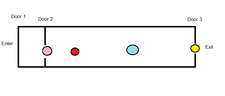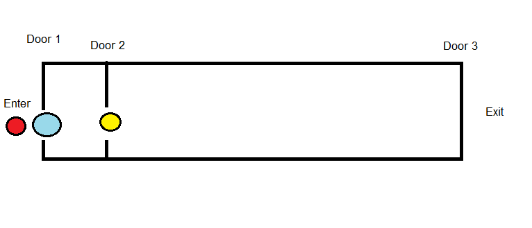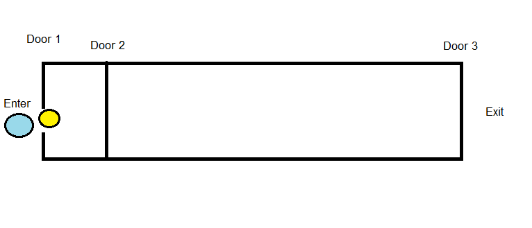 That is the hallway in question. The first two sets of doors are roughly two paces apart, while a long hallway stretches between the second and third door. Normally, this is just a mild inconvenience, having to stop and pull open each door to move on. But today? Today took a turn for the awkward.